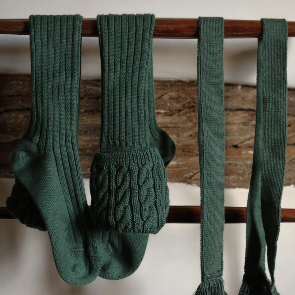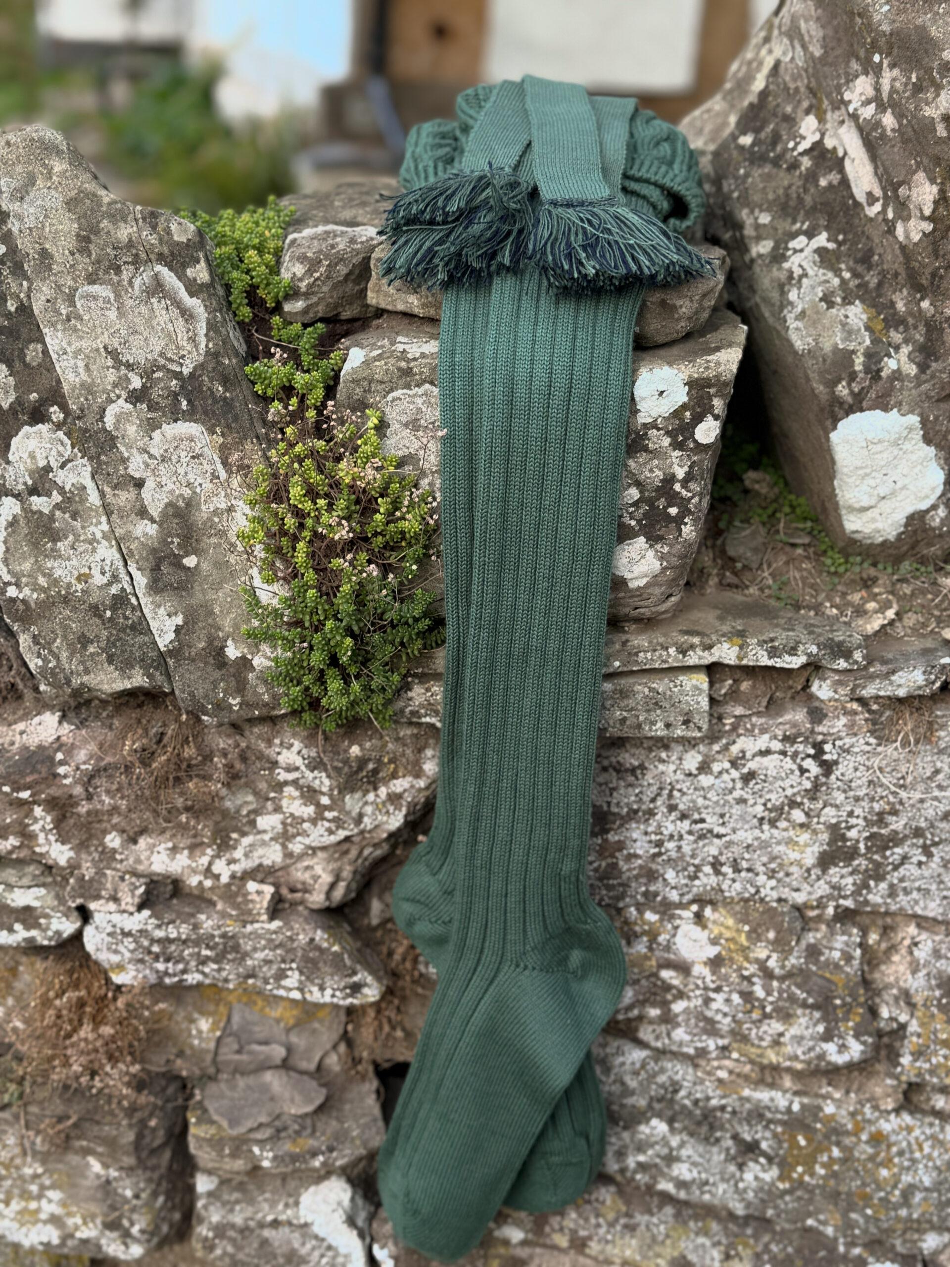 Our Fiddich shooting socks are made in Scotland from the finest Merino wool. They feature an intricate cable design in the top and each pair comes with matching garters.
